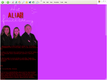 Welcome to Espier, an Alias fanlisting for all Alias fans. This fanlisting was established on the 21st of November, 2003, to unite and list all fans of Alias. According to the Webster's New World Dictionary, the world "fan" defines a person enthusiastic about a specified sport, past time, or performer; devotee. An Alias fan applies to anyone who likes to watch Alias. If you enjoy watching Alias, then you are entitled to join this fanlisting! Just read the rules below! back to the top Updates November 21st- Espier was established. back to the topRules #1. You must like Alias. Obviously. #2. If you have a website/URL/blog, please insert the code somewhere visible on a splash/clique/main page. If you change your URL or email address, please submit the new information at the Edit Information section. Please note that I will not accept sites which contains pornography. Swearing should be kept to a minimum. Please insert the code before signing up. #3. Those without a website are still eligible to join Espier. #4. In the box where it says "double agent" please type in "credit dauphine" so I will know that you have read the rules. back to the topCodes/images Please save this to your own server and link back to http://geocities.com/unofficialaliasfanlisting 88x31 (light background- with black border)